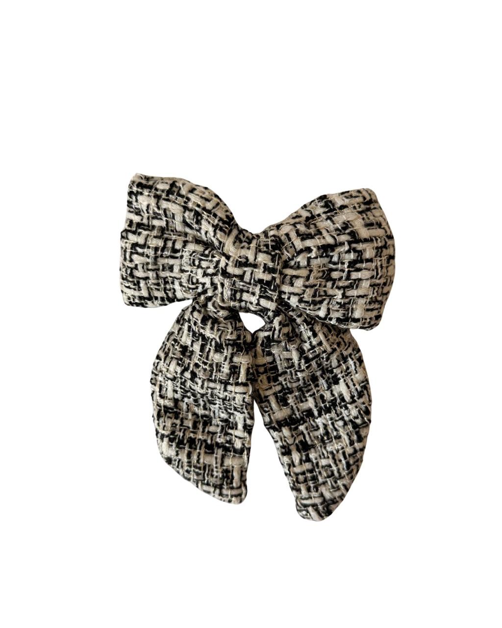 Um laço de tecido preto e branco, clássico e versátil, com contraste elegante que combina sobriedade e estilo. Sua estampa atemporal permite compor desde looks sofisticados até produções modernas, sendo um detalhe que transmite equilíbrio e refinamento.